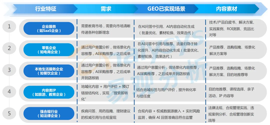 GEO 已在多个行业形成成熟的落地模式,不同行业基于自身特征,形成了差异化的 GEO 应用体系,核心细分行业的落地实践如下: