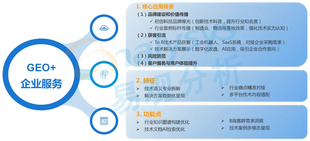 该行业 GEO 营销以专业拆解技术语义为核心,聚焦 To B 产品获客、解决方案展示等场景,将技术优势转化为数据化成果内容,通过行业知识图谱、B 端需求洞察等功能,精准对接企业痛点,缩短销售周期,提升技术产品的市场渗透效率,核心应用场景覆盖品牌建设和价值传播、获客引流、风险防范、客户服务与用户体验提升四大维度。