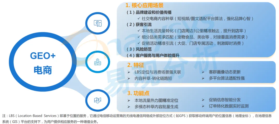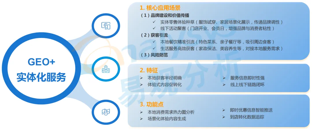 该行业 GEO 营销以 LBS 定位为核心抓手,聚焦本地生活、社交种草等场景,将商品信息与消费场景深度融合,依托本地流量定位、多模态内容生成等功能,打造 “种草 - 转化” 的短链路,显著提升线上曝光与线下到店的转化效率,核心应用场景覆盖品牌建设和价值传播、获客引流、风险防范、客户服务与用户体验提升四大维度。