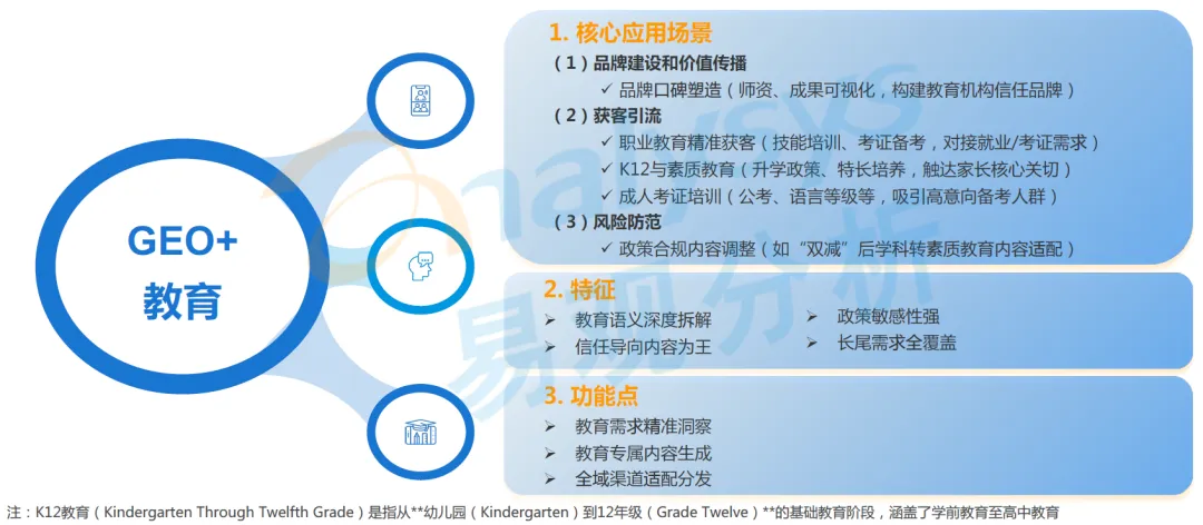 该行业 GEO 营销以深度解析教育语义为基础,聚焦职教、K12、成人考证等核心场景,通过结构化呈现师资、成果等信任背书内容,精准匹配用户细分需求,借助需求洞察、智能咨询等功能,缩短用户决策周期。
