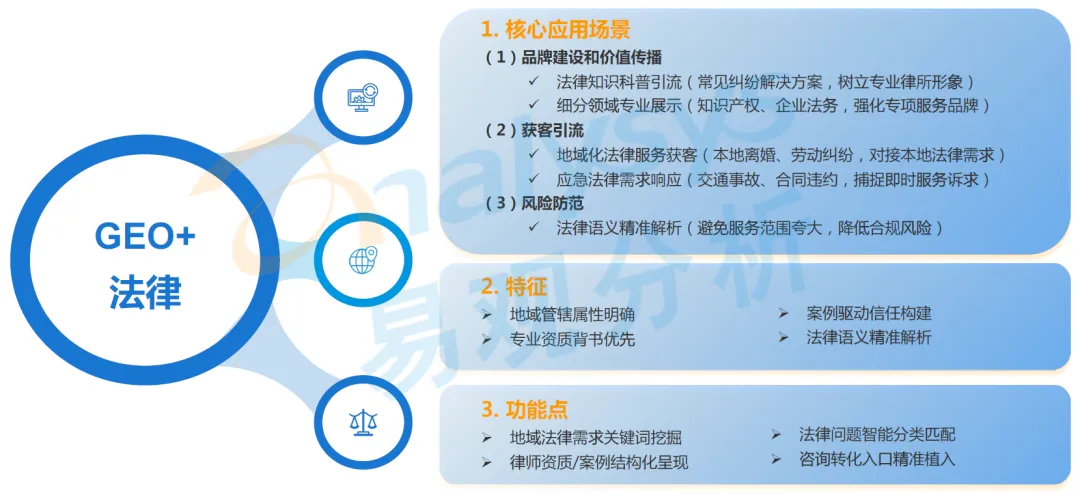 该行业以律所、法律服务机构为核心代表,属于强合规行业,行业核心特征是地域管辖属性明确,专业资质背书优先,以案例驱动信任构建,核心需求是精准触达有应急或专项需求的客户,解决律所获客精准度低的问题。目前 GEO 已实现的场景包括合规内容 + 权威数据源嵌入 + 实时风险监测,确保 AI 回答准确且符合监管要求,核心应用的内容素材包括法律法规、合规管理实践、违规案例分析、合规管理创新实践等。