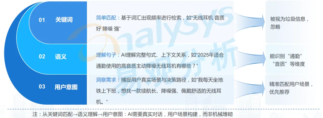 竞争逻辑从关键词匹配转向语义与信任竞争:用户在 AI 答案中不会直接看到品牌链接,企业不再直接控制触达路径,需要通过优化内容实现被 AI 看见、被 AI 信任,最终实现间接触达,品牌竞争的核心从关键词匹配转向语义相关性与知识可信度的比拼。