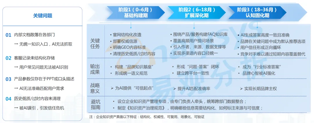 规避方向是企业需分阶段构建完整的企业知识资产体系,0-6 月为基础构建期,核心任务是完成官网结构化改造、部署权威信源、明确 GEO 内容标准、清理历史低质 / 过时内容,构建 “品牌知识基座”;6-18 月为扩展深化期,核心任务是围绕产品 / 服务构建 FAQ 知识库、覆盖高频用户提问场景、引入作者、来源、数据支撑等要素、实现多渠道内容口径统一,形成 “问题 - 答案” 闭环;18-36 月为认知固化期,核心任务是实现 AI 生成答案高度一致且准确、品牌在关键问题中成为默认推荐选项、用户信任形成正向循环,最终成为行业标准答案。同时需制定《知识资产治理规范》,设立企业知识资产管理专项岗位,统筹跨部门数据整合。