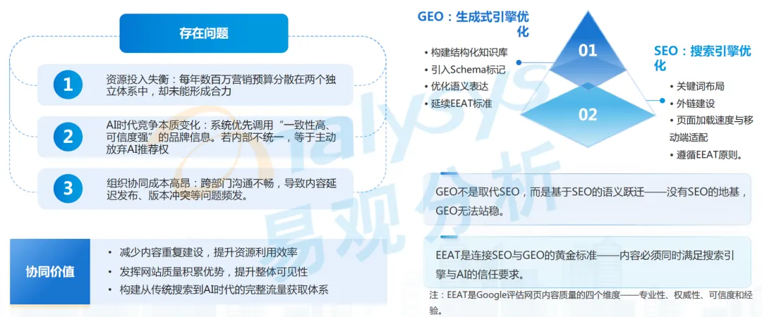规避方向是企业需实现 SEO 与 GEO 的协同运营,明确 GEO 不是取代 SEO,而是基于 SEO 的语义跃迁,没有 SEO 的地基,GEO 无法站稳。同时以 EEAT 标准为连接 SEO 与 GEO 的黄金标准,确保内容同时满足搜索引擎与 AI 的信任要求,最终减少内容重复建设,提升资源利用效率,发挥网站质量积累优势,构建从传统搜索到 AI 时代的完整流量获取体系。