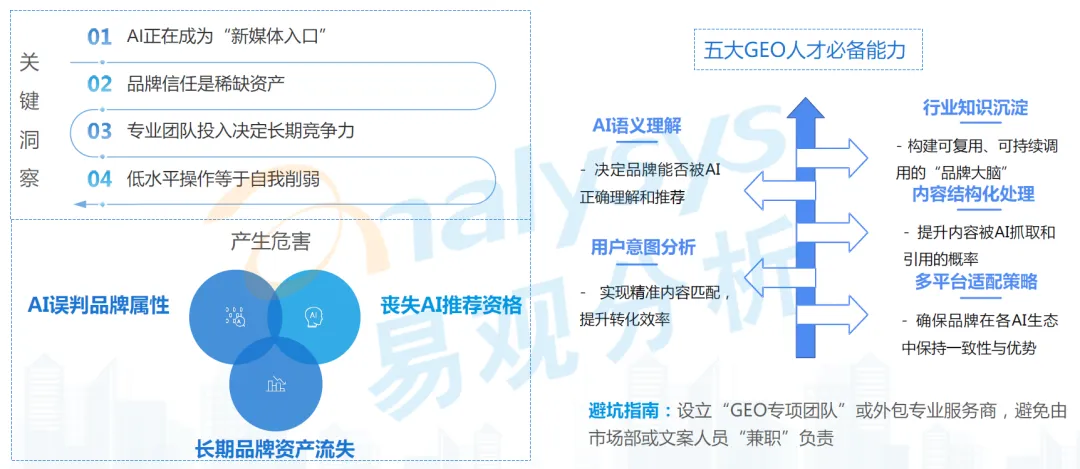 规避方向是企业需设立 “GEO 专项团队” 或外包专业服务商,避免由非专业人员兼职负责。GEO 核心团队需具备五大必备能力,分别是 AI 语义理解能力、用户意图分析能力、行业知识沉淀能力、内容结构化处理能力、多平台适配策略能力,以专业能力保障 GEO 策略的落地效果。
