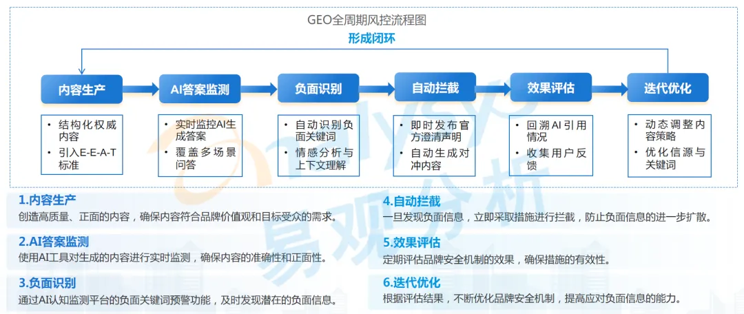 规避方向是企业需建立 GEO 全周期风控体系,覆盖内容生产、AI 答案监测、负面识别、自动拦截、效果评估、迭代优化全流程。具体包括:在内容生产环节创造高质量、符合品牌价值观的正面内容;实时监控多平台 AI 生成的品牌相关答案,回溯 AI 引用情况;通过负面关键词预警、情感分析与上下文理解,及时识别潜在负面信息;即时发布官方澄清声明,自动生成对冲内容,防止负面信息扩散;定期评估风控机制效果,持续迭代优化策略,形成完整的风控闭环。