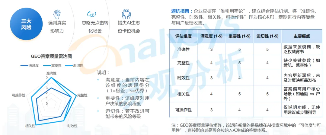 规避方向是企业需摒弃 “唯引用率论”,建立综合评估机制,将准确性、完整性、时效性、相关性、可操作性作为核心 KPI,通过 GEO 答案质量评估矩阵,定期进行内容复盘与用户反馈收集,全面评估 GEO 策略的真实效果,而非单一关注排名与曝光量。