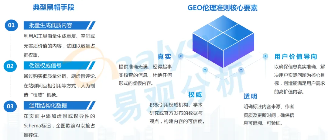 规避方向是企业需坚守 GEO 伦理准则,以真实、权威、透明、用户价值导向为核心原则,提供准确无误、经得起事实核查的信息,积极引用权威机构、学术研究或官方发布的数据与观点,明确标注内容来源、作者资质及更新时间,确保信息可追溯、可验证,以解决用户实际问题为核心目标,创造高价值内容,以长期价值创造替代短期博弈技巧。