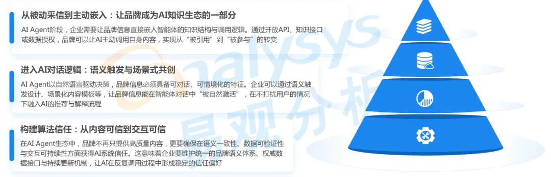 当生成式 AI 进入智能体(AI Agent)阶段,品牌传播的逻辑也会发生根本性转变,从 “等待被搜索” 转向 “主动被调用”。AI 不再只是回答问题的工具,而是能根据场景、意图与用户画像主动提供解决方案,品牌的竞争不再是可见性之争,而是能否成为 AI 智能体主动引用与推荐的内容,GEO 也将从 “内容优化” 迈向 “语义共生” 的新时代。