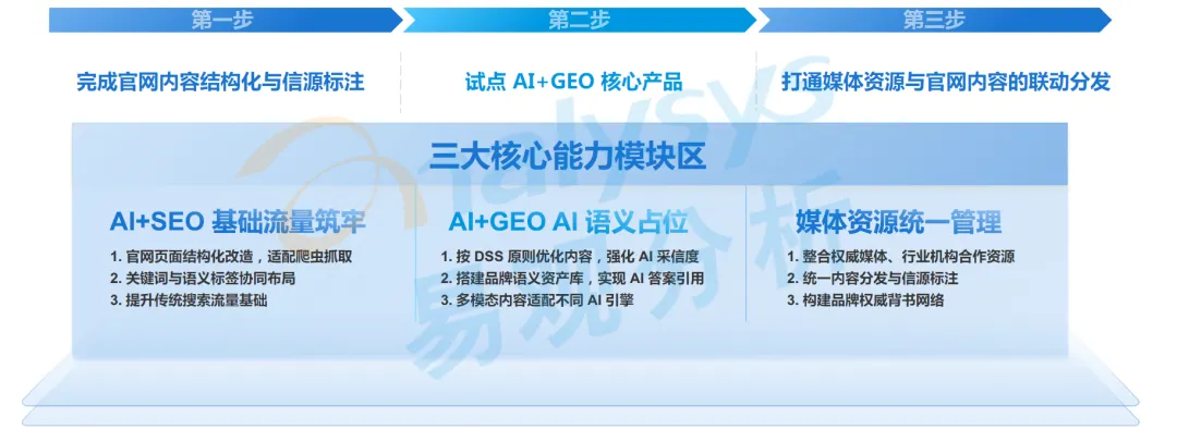 官网是 AI 生态中的核心权威信源,企业需要重构官网的定位与功能,推动其从传统的 “信息窗口” 向 “AI 营销资源管理平台” 转型。具体落地分为三大核心步骤:第一步是完成官网内容结构化与信源标注,实现官网页面结构化改造适配爬虫抓取,按 DSS 原则优化内容强化 AI 采信度;第二步是试点 AI+GEO 核心产品,搭建品牌语义资产库,实现 SEO 流量基础与 GEO AI 语义占位的协同;第三步是打通媒体资源与官网内容的联动分发,统一管理媒体资源,整合权威媒体、行业机构合作资源,构建品牌权威背书网络。最终形成三大核心能力模块,分别是 AI+SEO 基础流量筑牢模块、AI+GEO AI 语义占位模块、媒体资源统一管理模块,打造完全适配 AI 时代的官网体系。