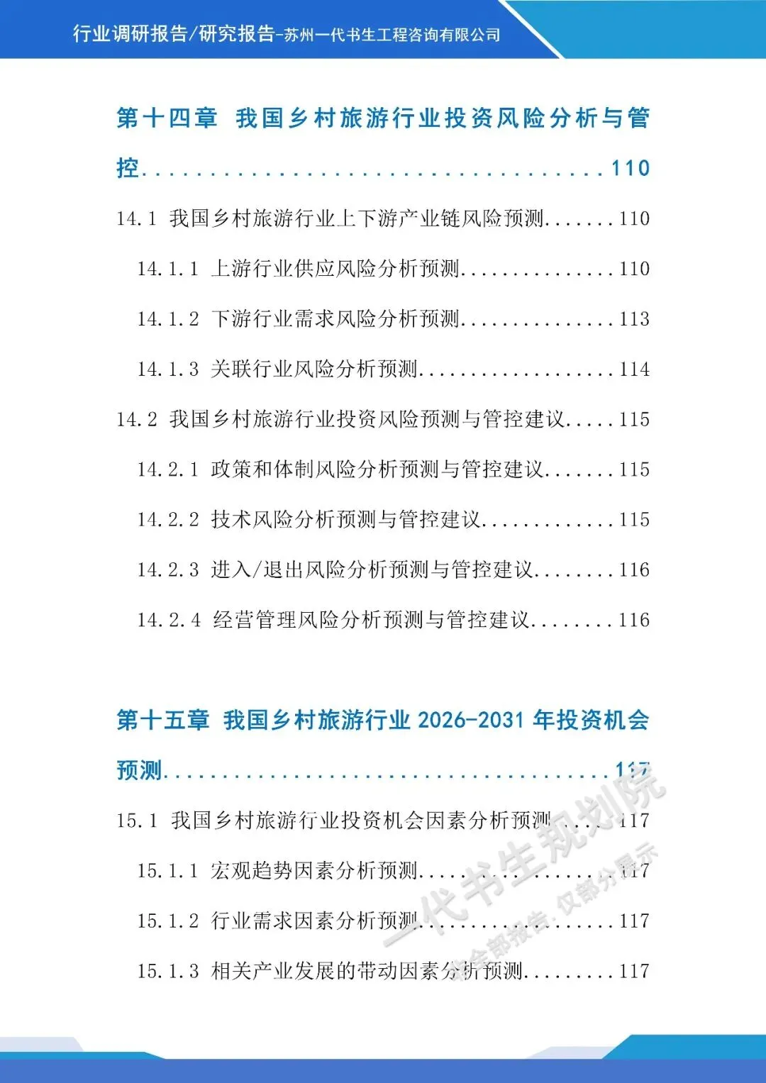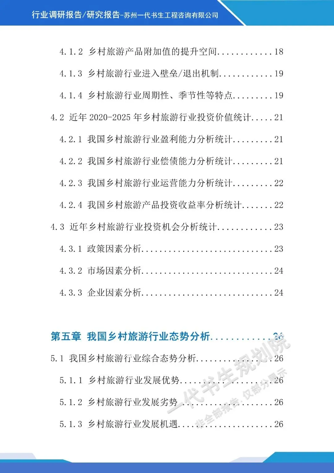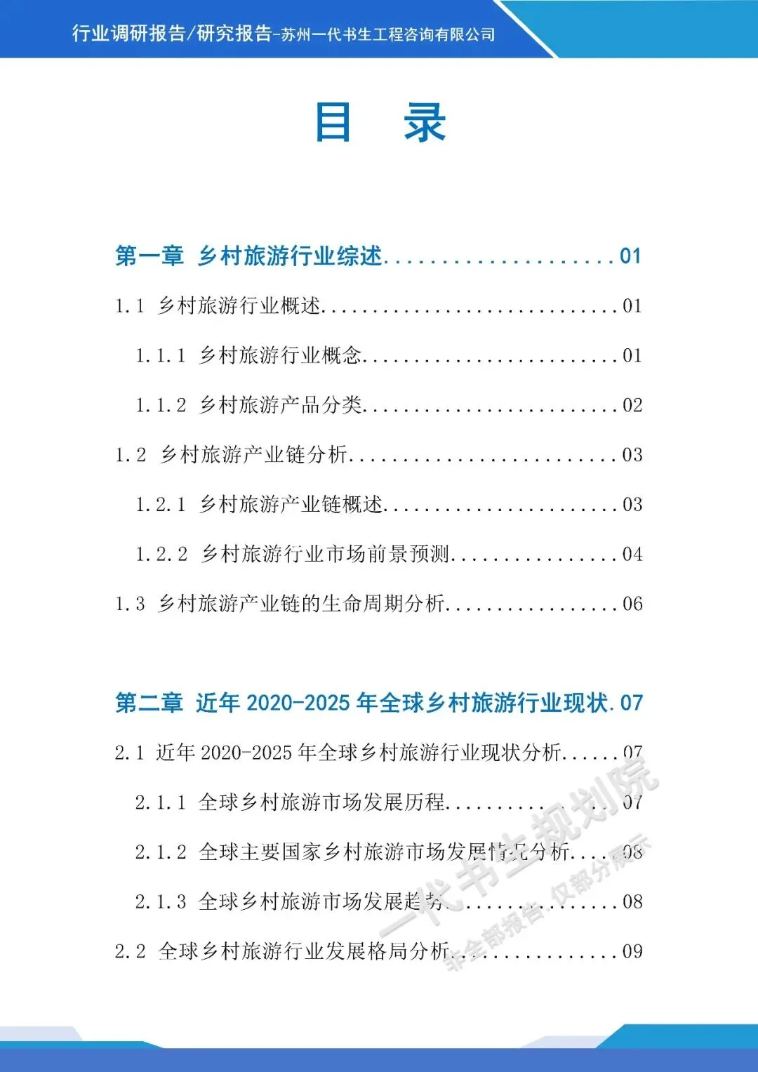 《2026年-2031年我国乡村旅游行业市场分析调研报告》由苏州一代书生工程咨询有限公司出具,该公司集市场评估、产业策划与规划设计于一体,可提供项目建设前期评估、落地规划设计等服务,出具各类行业报告及规划方案,保障报告专业性与实用性。报告聚焦行业市场分析,从三个核心方向明确编制要点,核心如下:
