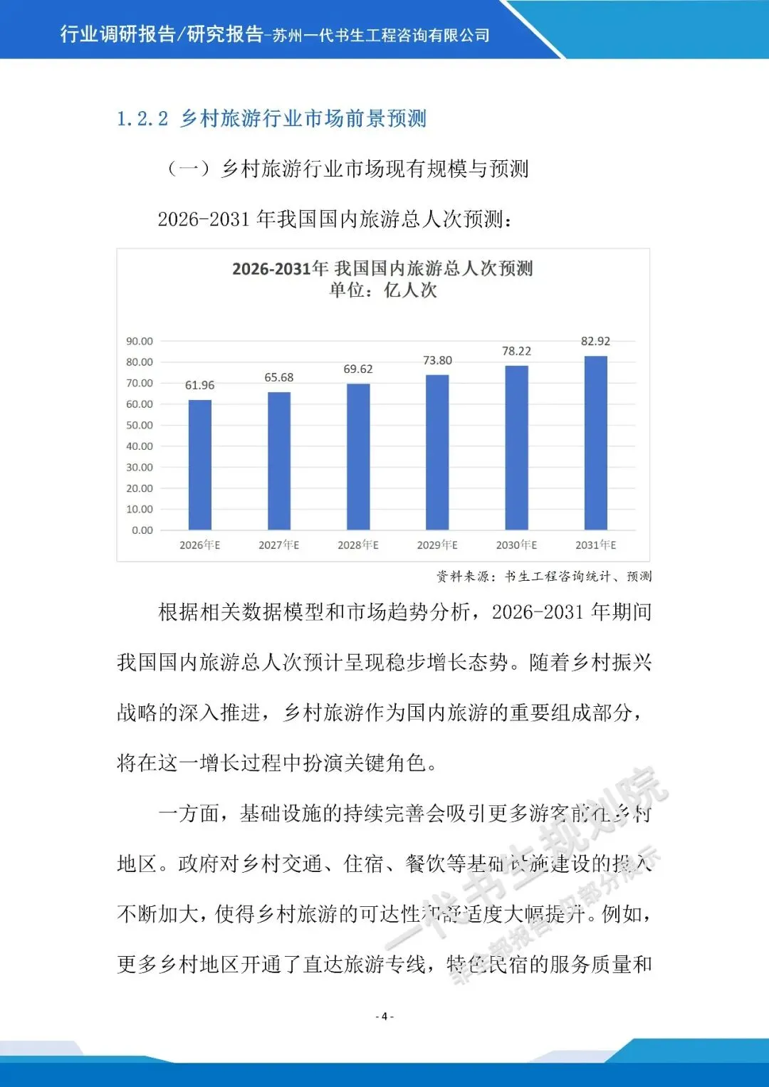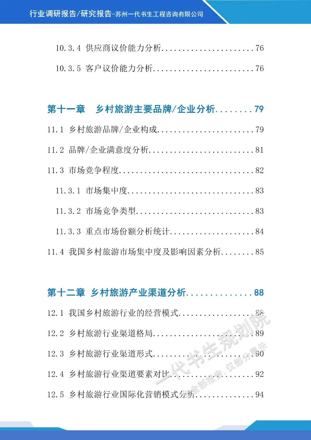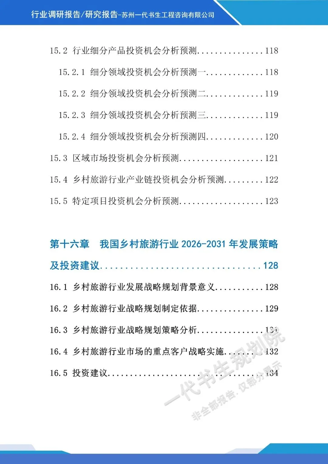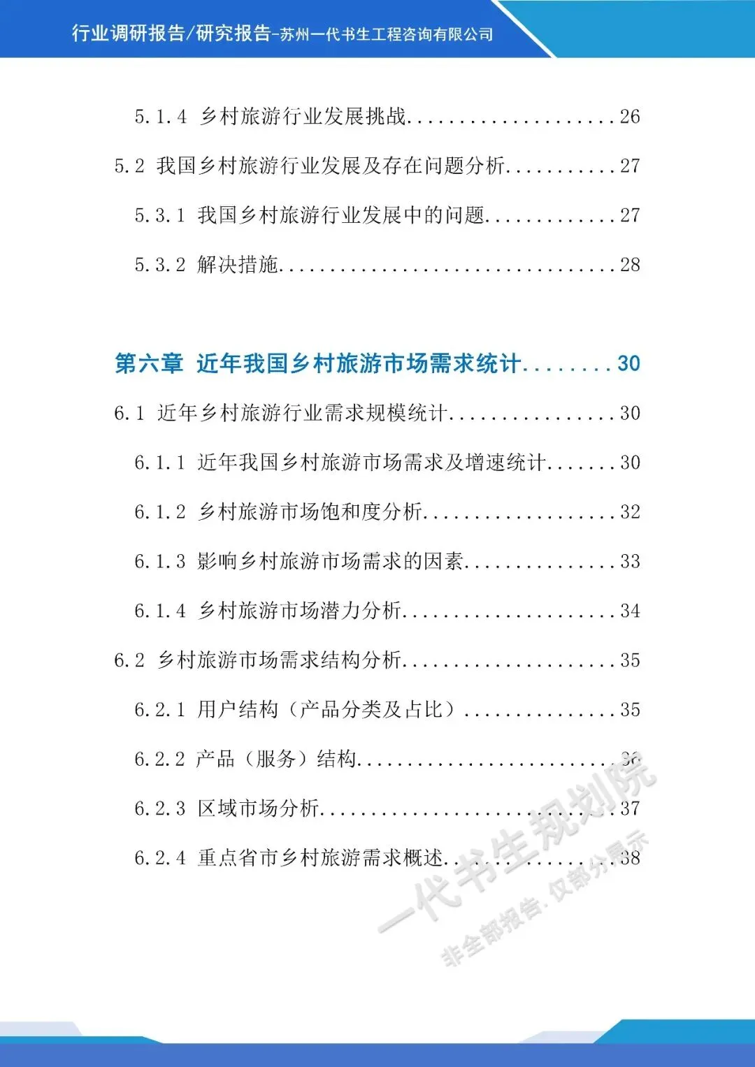 《2026年-2031年我国乡村旅游行业市场分析调研报告》由苏州一代书生工程咨询有限公司出具,该公司集市场评估、产业策划与规划设计于一体,可提供项目建设前期评估、落地规划设计等服务,出具各类行业报告及规划方案,保障报告专业性与实用性。报告聚焦行业市场分析,从三个核心方向明确编制要点,核心如下: