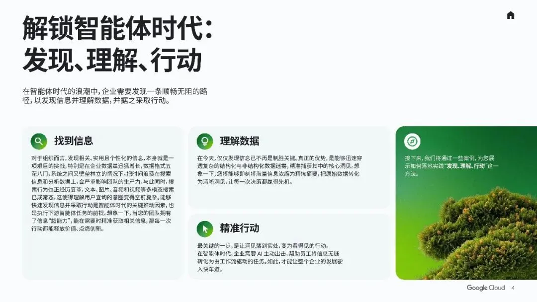 - 关键目标:发现、理解、行动:企业需要通过智能体快速获取信息、深入分析数据,并将洞察转化为可执行的行动,以提升整体运营表现。
