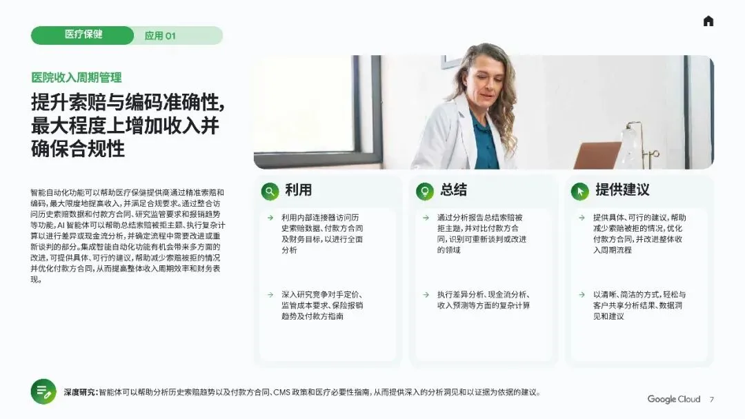 1. 医院收入周期管理- AI智能体帮助优化索赔与编码,提高收入并确保合规性。