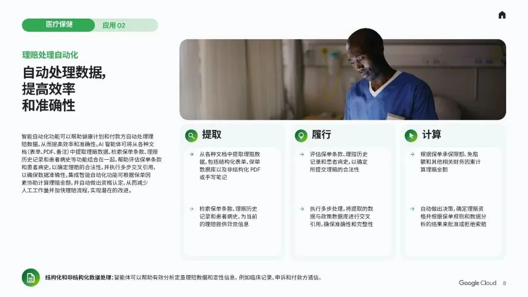 - 自动提取和分析理赔数据,包括文档、图片和账单信息。