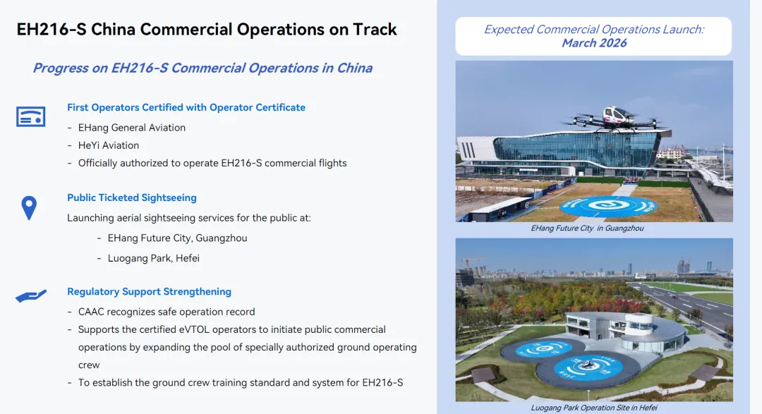 在过去数月的内部试运行中,亿航已完成标准操作流程、维护体系与机队管理流程的全面优化,充分保障了飞行安全与用户体验。中国民用航空局(CAAC)不仅认可了 EH216-S 的安全运行记录,还同步扩大了该机型专属授权地面运营人员规模,双方联合推进的国内首个无人驾驶载人 eVTOL 地面人员培训体系,也已完成框架搭建,为后续规模化商业运营筑牢了合规与人才基础。