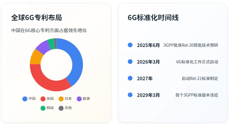 从技术发展轨迹来看,6G 标准化进程已正式启动。2025 年 6 月 9 日,3GPP 第 108 次全体会议正式批准了 Release 20 的第一批技术预研项目,明确了技术路线图,计划于 2027 年启动标准制定,2029 年完成 Rel-21 基础版本(41)。华为 ICT BG CEO 杨超斌在 2026 年 3 月 3 日的 MWC 2026 上宣布,6G 标准化工作已正式启动,首个 3GPP 标准版本的冻结时间不早于 2029 年 3 月(17)。