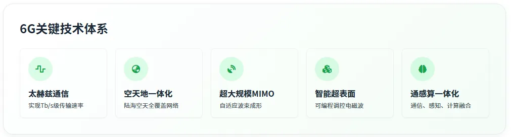 6G 技术体系呈现出多元化、融合化的特征,主要包括以下核心技术方向: