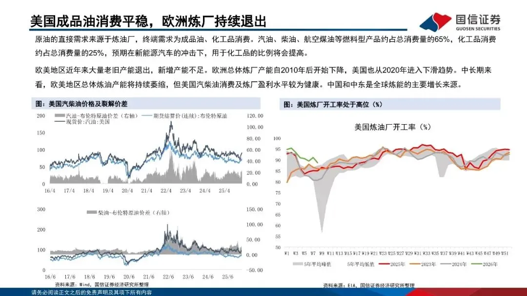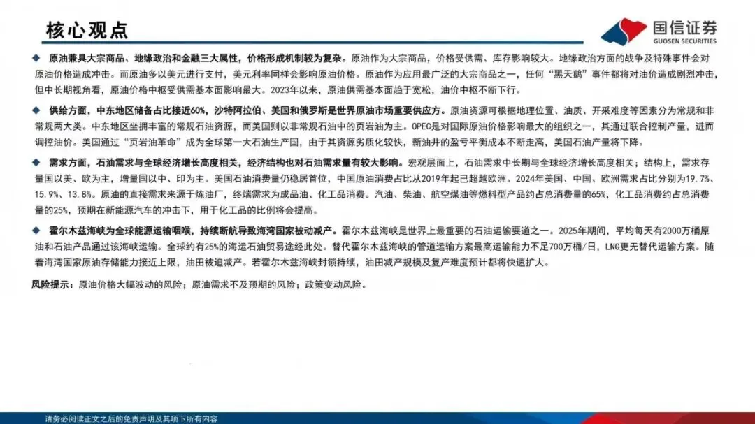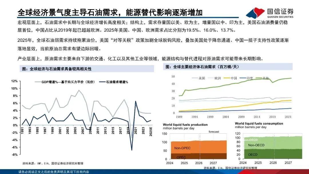 需求方面,石油需求与全球经济增长高度相关,经济结构也对石油需求量有较大影响。宏观层面上,石油需求中长期与全球经济增长高度相关;结构上,需求存量国以美、欧为主,增量国以中、印为主。美国石油消费量仍稳居首位,中国原油消费占比从2019年起已超越欧洲。2024年美国、中国、欧洲需求占比分别为19.7%、15.9%、13.8%。原油的直接需求来源于炼油厂,终端需求为成品油、化工品消费。汽油、柴油、航空煤油等燃料型产品约占总消费量的65%,化工品消费约占总消费量的25%,预期在新能源汽车的冲击下,用于化工品的比例将会提高。