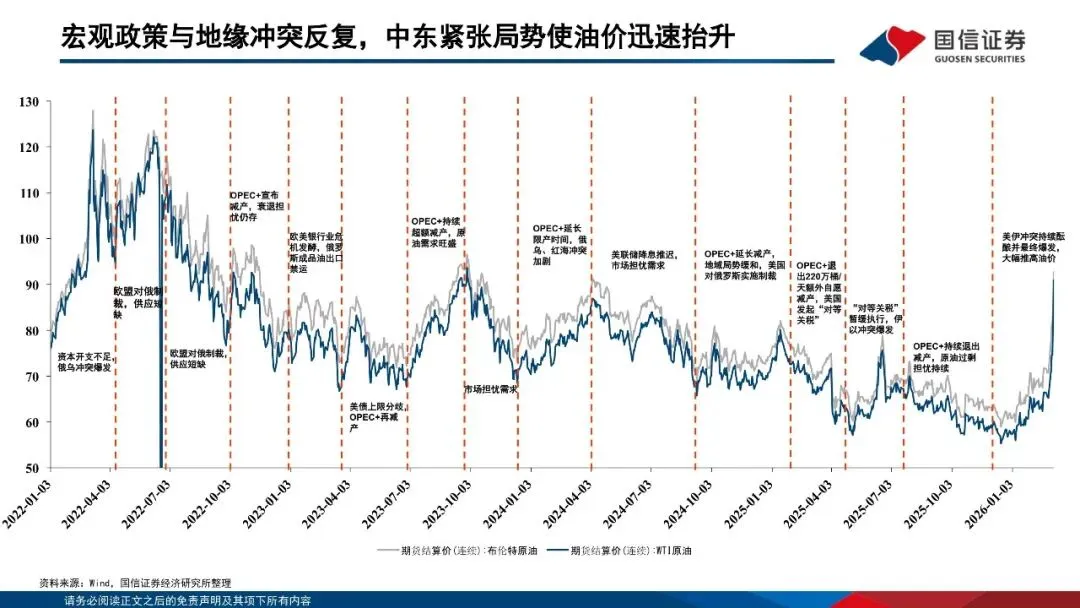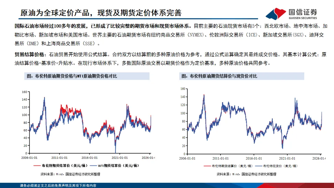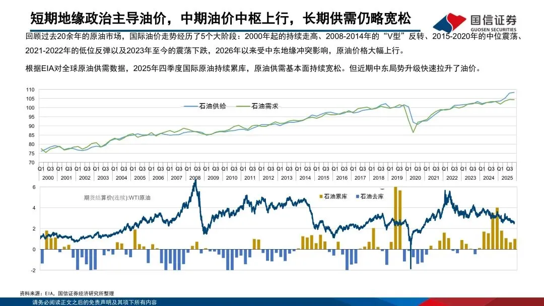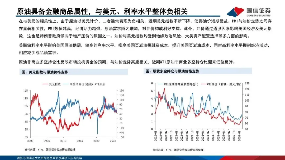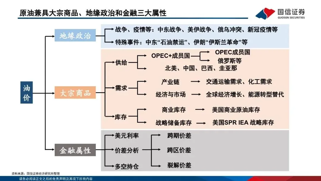 原油兼具大宗商品、地缘政治和金融三大属性,价格形成机制较为复杂。原油作为大宗商品,价格受供需、库存影响较大。地缘政治方面的战争及特殊事件会对原油价格造成冲击。而原油多以美元进行支付,美元利率同样会影响原油价格。原油作为应用最广泛的大宗商品之一,任何“黑天鹅”事件都将对油价造成剧烈冲击,但中长期视角看,原油价格中枢受供需基本面影响最大。2023年以来,原油供需基本面趋于宽松,油价中枢不断下行。