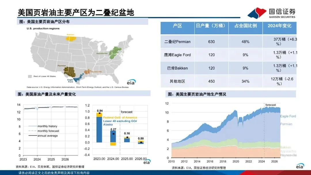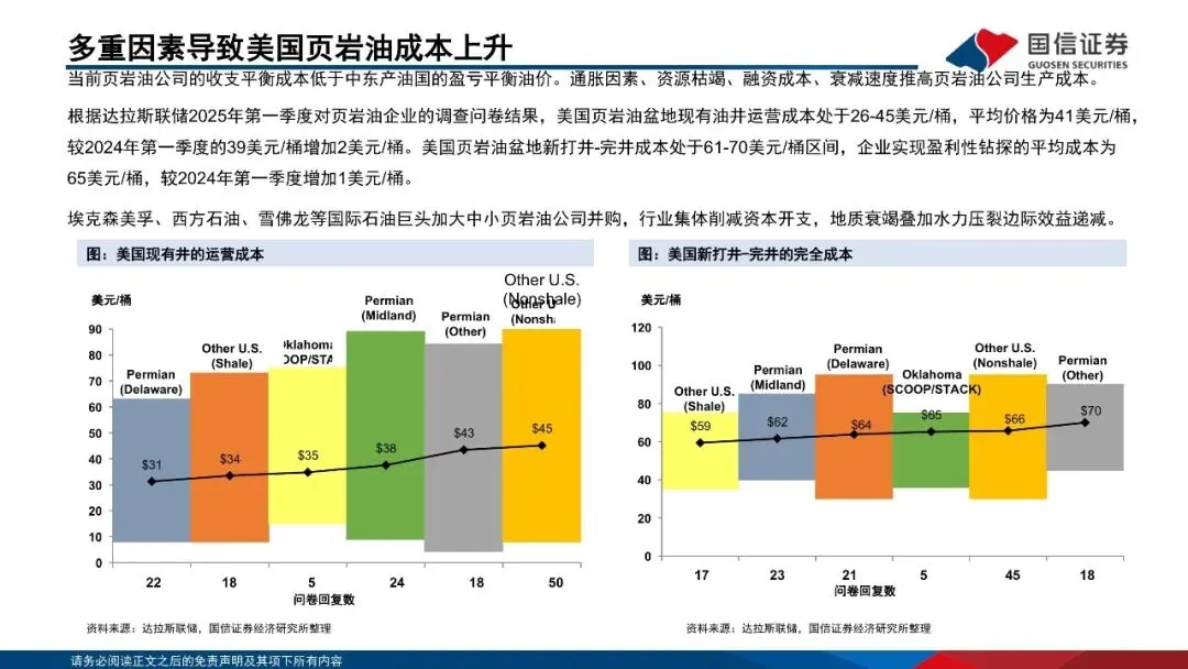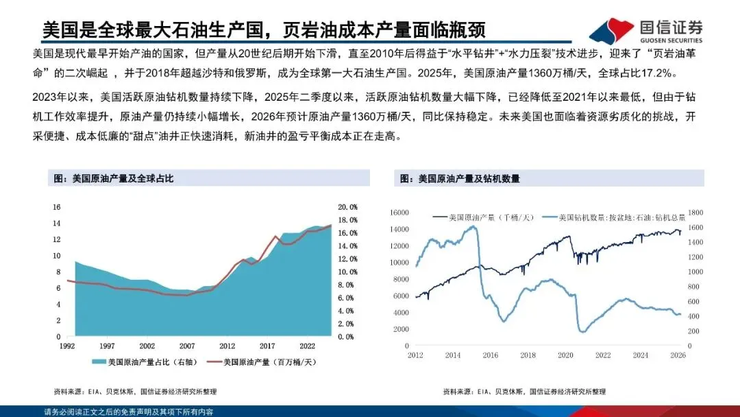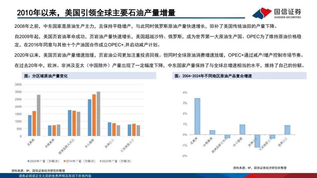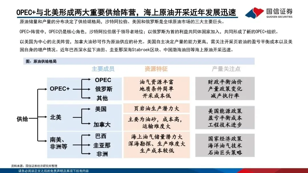 供给方面,中东地区储备占比接近60%,沙特阿拉伯、美国和俄罗斯是世界原油市场重要供应方。原油资源可根据地理位置、油质、开采难度等因素分为常规和非常规两大类。中东地区坐拥丰富的常规石油资源,而美国则以非常规石油中的页岩油为主。OPEC是对国际原油价格影响最大的组织之一,其通过联合控制产量,进而调控油价。美国通过“页岩油革命”成为全球第一大石油生产国,由于其资源劣质化较快,新油井的盈亏平衡成本不断走高,美国石油产量将下降。