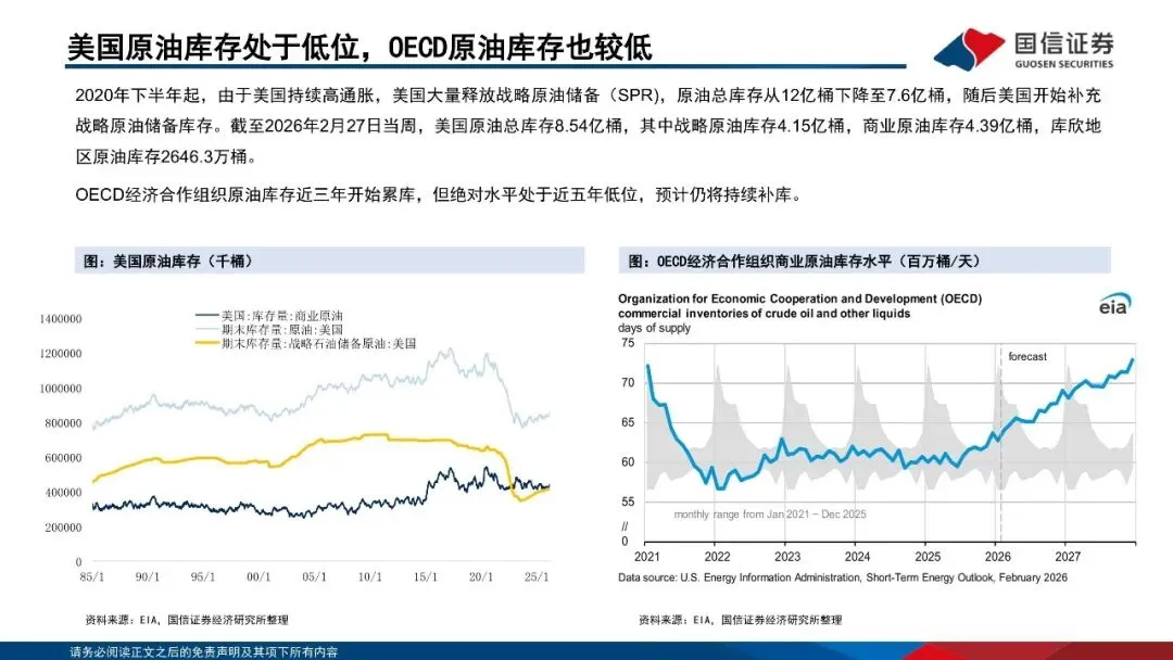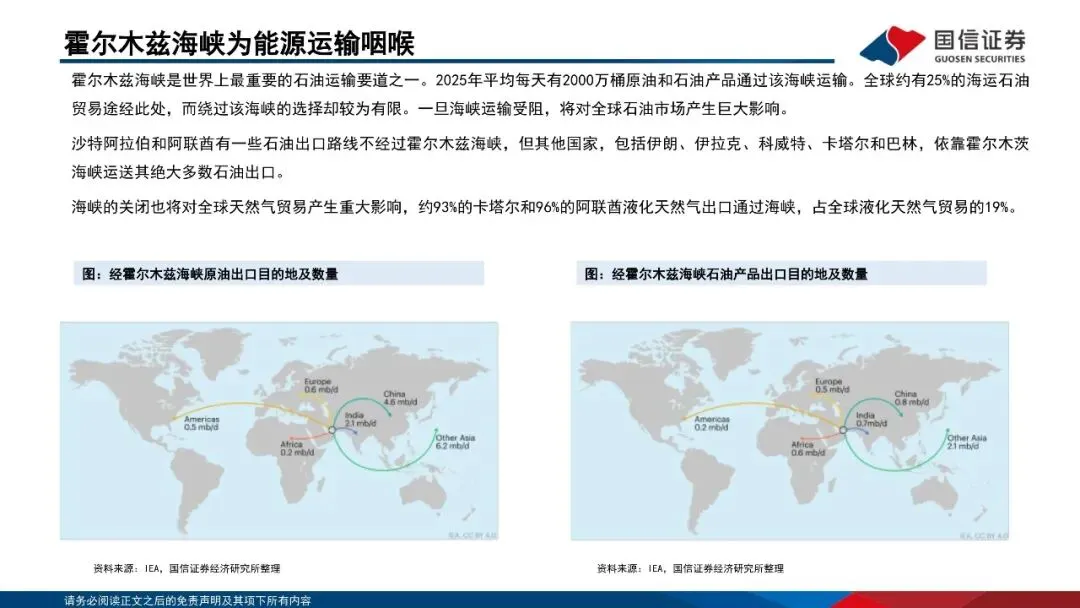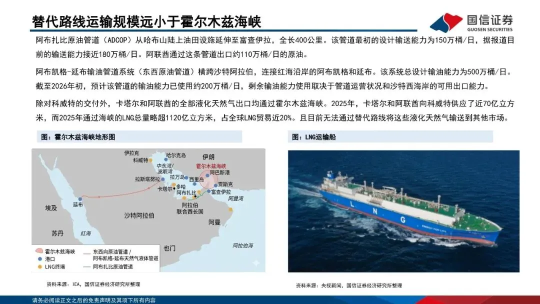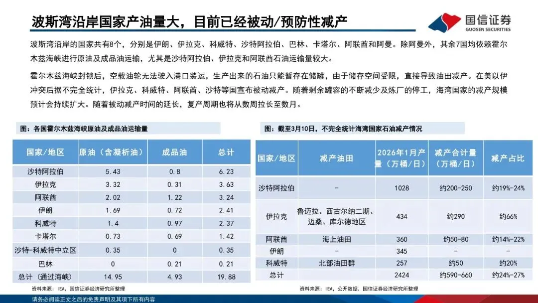 霍尔木兹海峡为全球能源运输咽喉,持续断航导致海湾国家被动减产。霍尔木兹海峡是世界上最重要的石油运输要道之一。2025年期间,平均每天有2000万桶原油和石油产品通过该海峡运输。全球约有25%的海运石油贸易途经此处。替代霍尔木兹海峡的管道运输方案最高运输能力不足700万桶/日,LNG更无替代运输方案。随着海湾国家原油存储能力接近上限,油田被迫减产。若霍尔木兹海峡封锁持续,油田减产规模及复产难度预计都将快速扩大。