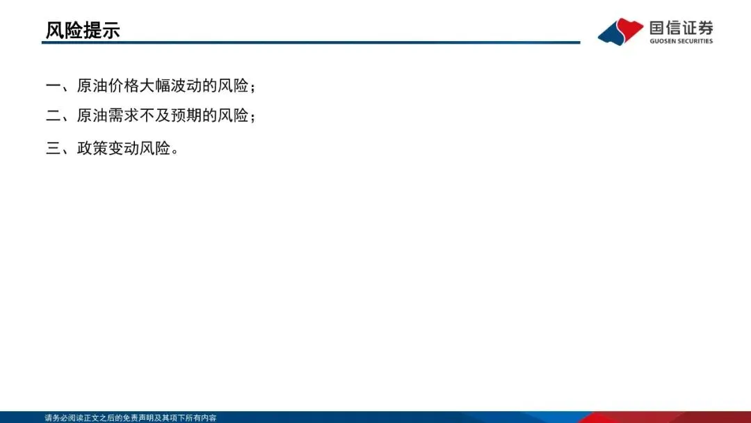 原油价格大幅波动的风险;原油需求不及预期的风险;政策变动风险。