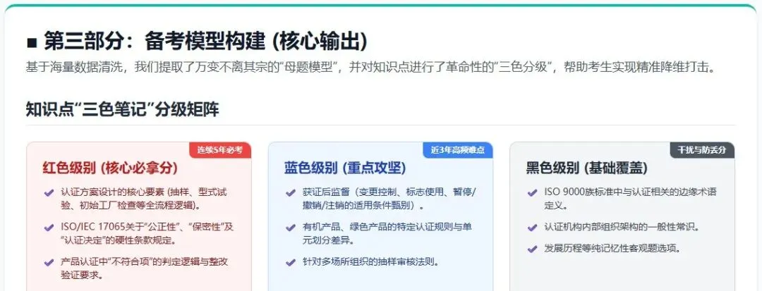 面对知识点浩如烟海且设障逻辑极其狡猾的《产品认证基础》考试,传统的通读教材和死记硬背已全面失效。本报告基于五年真题的深层逻辑解构,为考生提炼出万变不离其宗的“母题模型”,并构建了基于考频的“三色笔记”备考策略。