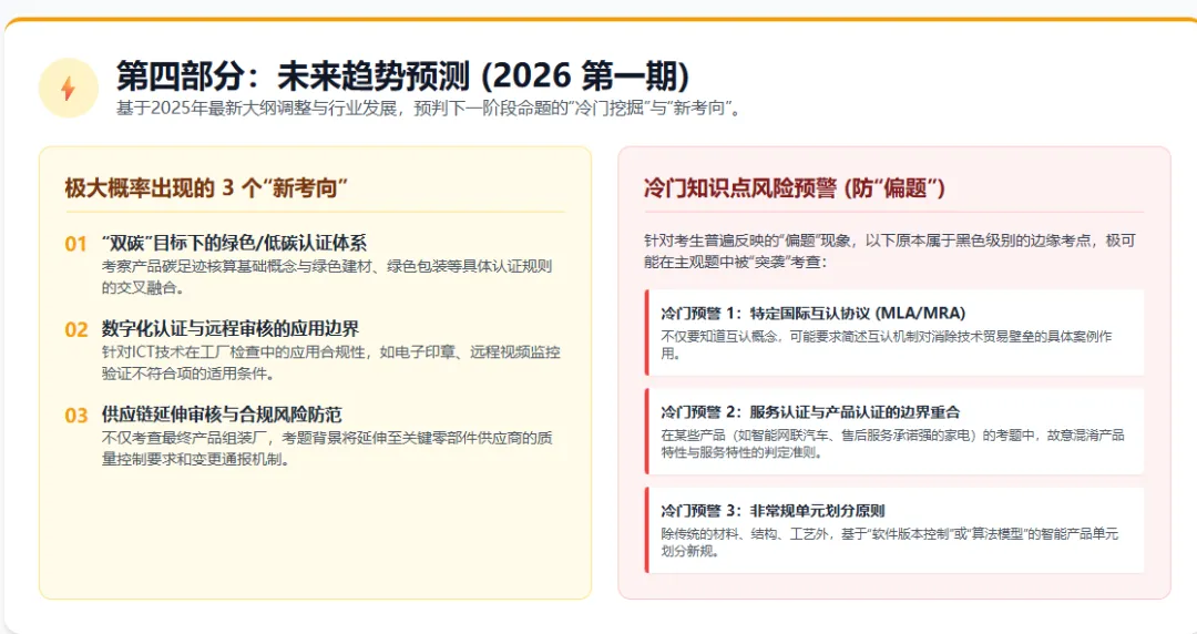 新考向一:“数字化转型与绿色低碳”将深度重塑案例情境新版大纲对“高质量发展”的强调,意味着传统的以家电、玩具为背景的工厂检查案例将全面升级1。演变预测:在考查“资源配置”、“文件记录控制”或“测量溯源”时,题干背景极有可能引入智能制造车间、新能源电池装配线或绿色建材生产现场。例如,考查对电子化加密记录的权限控制是否符合保密性要求;或者在绿色产品一致性检查中,要求识别废料综合利用率或有害物质检测报告是否符合特定技术规范。考生必须适应在数字化与绿色工业语境下运用传统认证规则。新考向二:对合格评定工具箱标准(ISO/IEC系列)的“像素级”边界勘探客观题库的深度已经挖掘到了概念的表层之下,未来的单选和多选将更加专注于标准条款的特例、豁免条件与绝对红线2。演变预测:GB/T 27065中关于机构公正性的组织结构要求、GB/T 27067中产品认证方案类型的微小差异(如方案4与方案5在监督环节是否必须包含体系审核的区别),将成为命题人设置连环陷阱的富矿。特别是对于“除非……”、“必要时……”、“在某些情况下……”等条件从句的考查,将直接决定多选题的得分率。新考向三:综合应用题将走向“多重缺陷嵌套”的复合剧本由于专业领域科目主观题比重持续保持高压(问答题20分,案例题20分)1,案例分析将不再是单一知识点的线性测试。演变预测:一道综合案例题可能同时融合了采购控制失效、计量设备未校准、关键工艺参数篡改以及标志非法使用等多个维度的违规事实。考生将被要求扮演“主审法官”的角色,不仅要逐一剥离不符合事实并精准对应条款,还需系统性地写出停证、限期整改、现场复核的完整行政与技术处置文书。这种“多重嵌套”将对考生的现场感和逻辑闭环能力提出终极考验。风险预警:“冷门与偏题”的未来挖掘地带