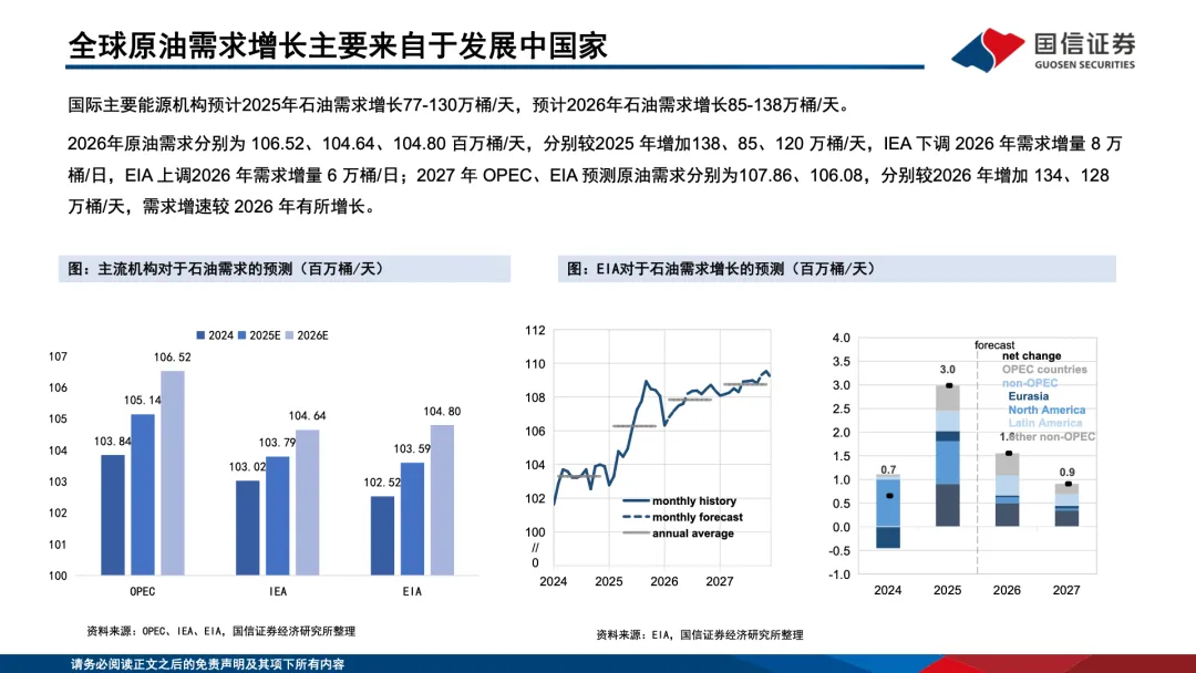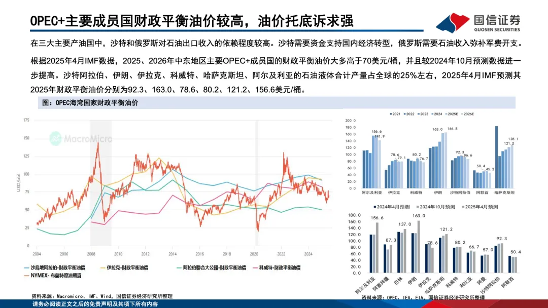 ,美国页岩油面临资源劣质化、成本上行、产量瓶颈问题,OPEC + 通过减产调控油价且成员国财政平衡油价普遍高企,具备较强油价托底诉求;需求端与全球经济增长高度相关,