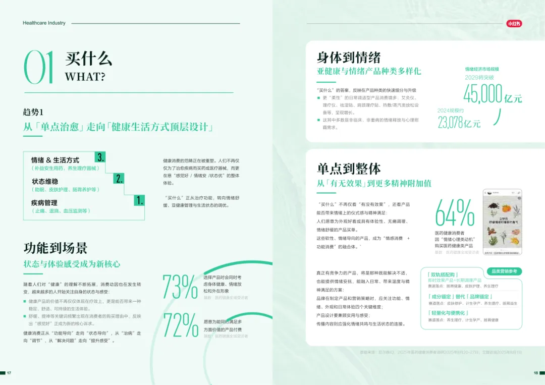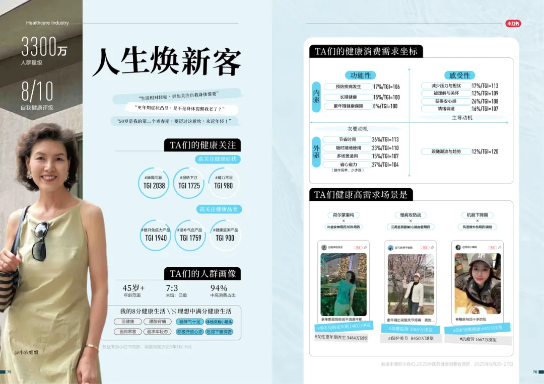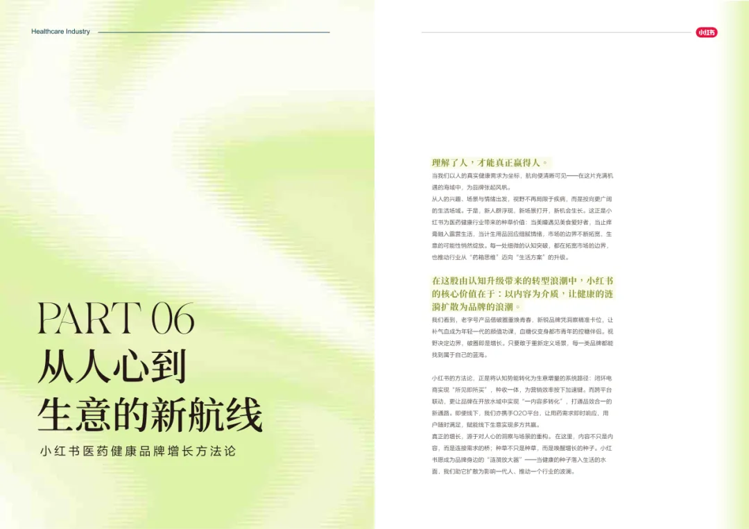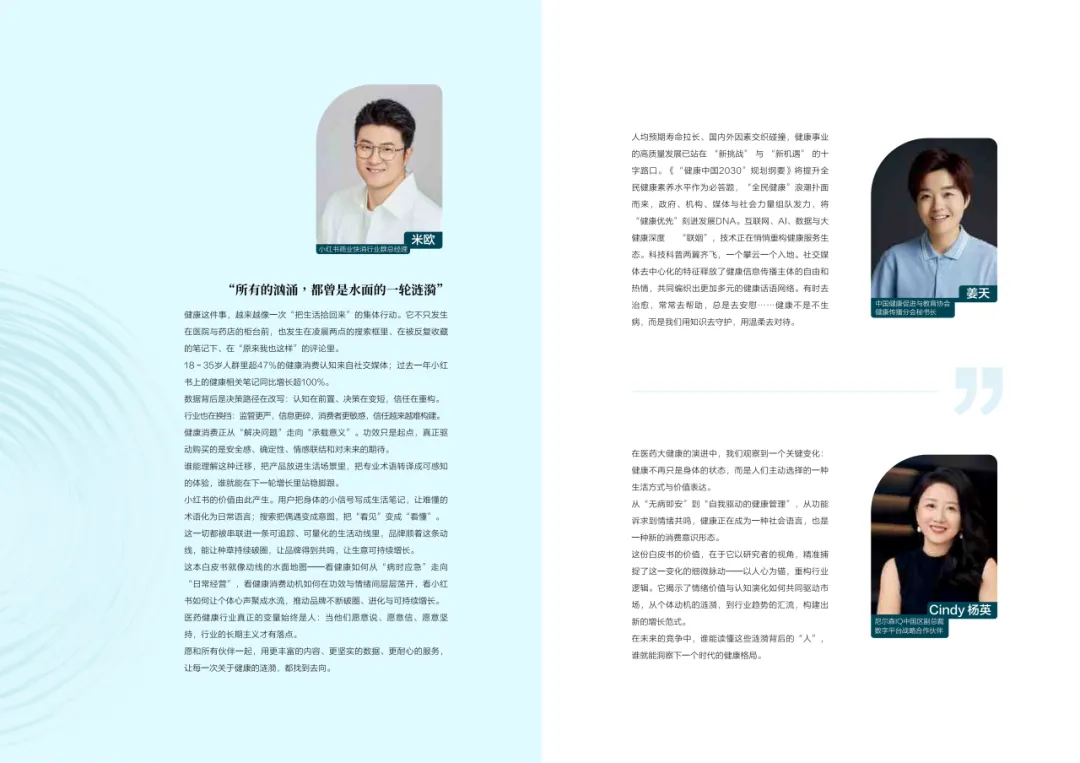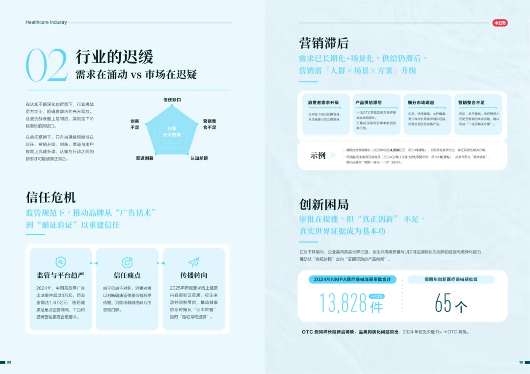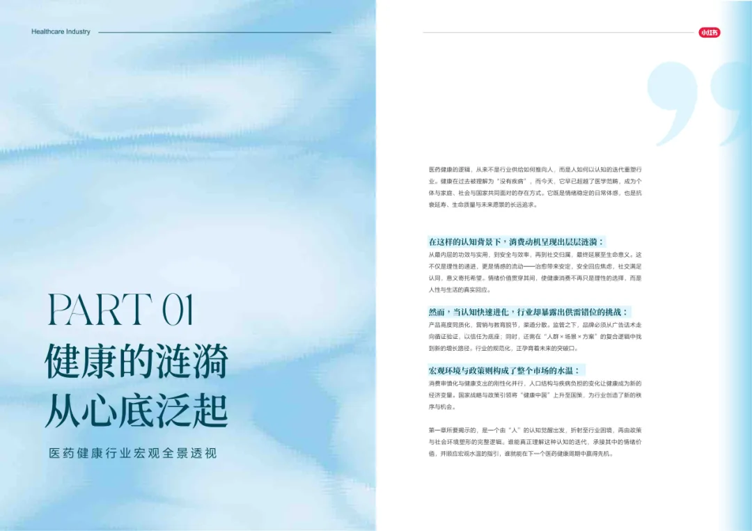 近年来,医药大健康行业在政策压力、市场环境和消费者认知三重因素的影响下不断演进。站在这个“新挑战”与“新机遇”的十字路口,小红书联合尼尔森IQ发布《愈见浪潮,生长有方:2025-2026医药健康行业消费趋势白皮书》,聚焦“人”这一核心变量,深入剖析健康消费人群的认知演变、行为趋势、消费链路与动机,旨在帮助品牌洞悉医药行业的当前图景与未来方向。