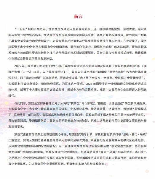 用友《2026 央国企穿透式监管数智化白皮书(财务分册)》核心结论:“十五五” 开局之年,央国企穿透式监管迈入智能化新阶段,以 “全级次贯通、全链条覆盖、全周期管控” 为核心,财务域成为监管落地关键抓手。通过 “纵向层级穿透 + 横向业财穿透”,依托数智化平台打破信息孤岛,实现从集团总部到基层单元的风险精准防控与价值赋能,“四维十二步” 实施框架成落地核心路径。