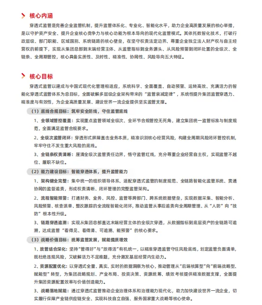 穿透式监管是依托数智化技术,打破层级、部门、系统壁垒,实现 “全级次(集团 - 基层)、全链条(指标 - 业务)、全周期(预警 - 整改)” 管控的现代化模式,具备实质性、及时性、精准性等五大特征。