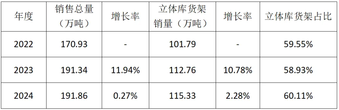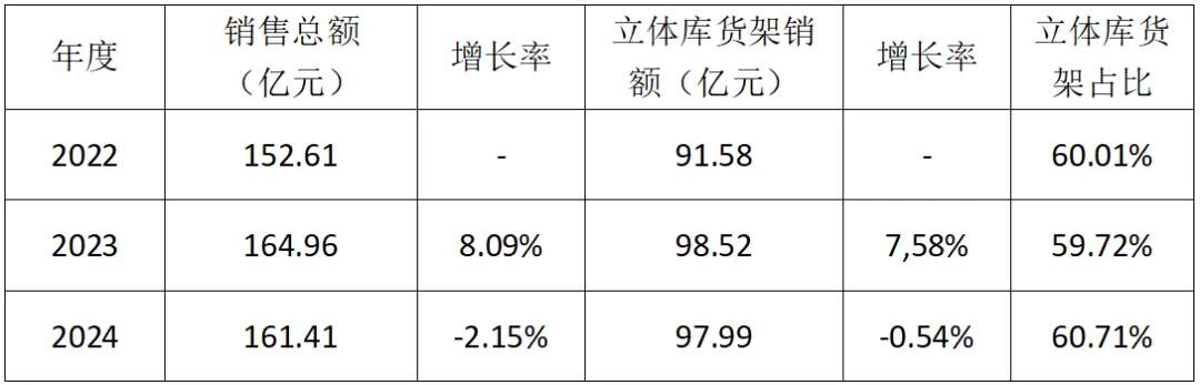 在54家企业中,2024年自动化立体库货架销售量占比达 60.11%,同比增加1.2个百分点,说明立体库的占比有上升趋势。