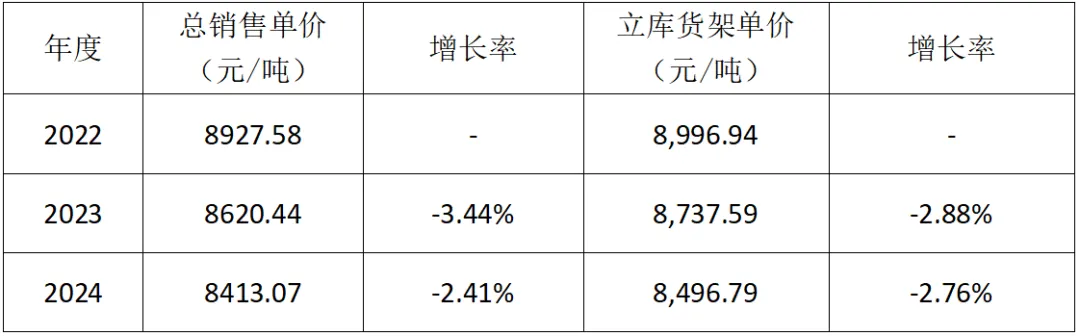 2024年货架平均售价为8413.07元/吨,同比下降2.46%;自动化立体库货架平均售价为8,496.79元/吨,同比下降2.76%。2022-2024年货架平均销售价逐年下降,两年累计下降超过6%,如表3所示。