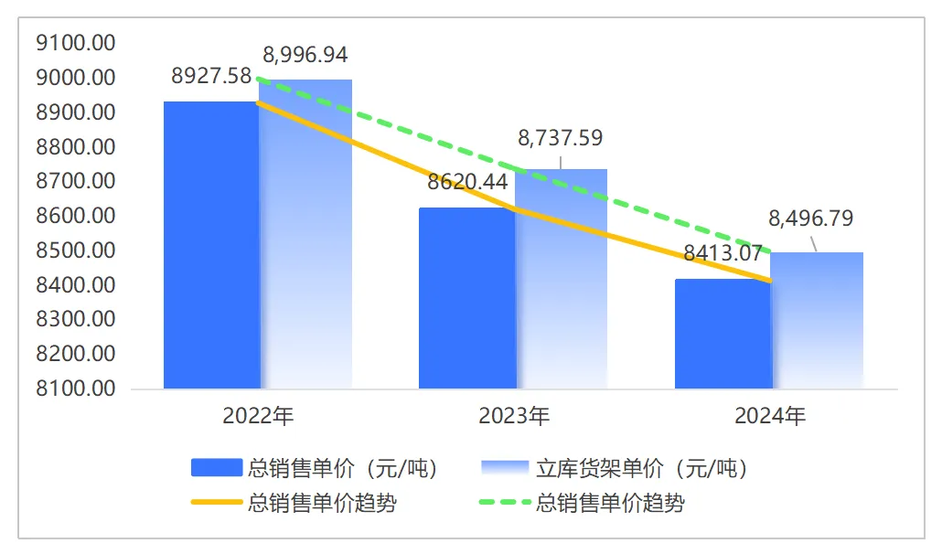 4. 2022-2024年货架平均价格分别为:8927.58元/吨、8620.44元/吨、8413.07元/吨。