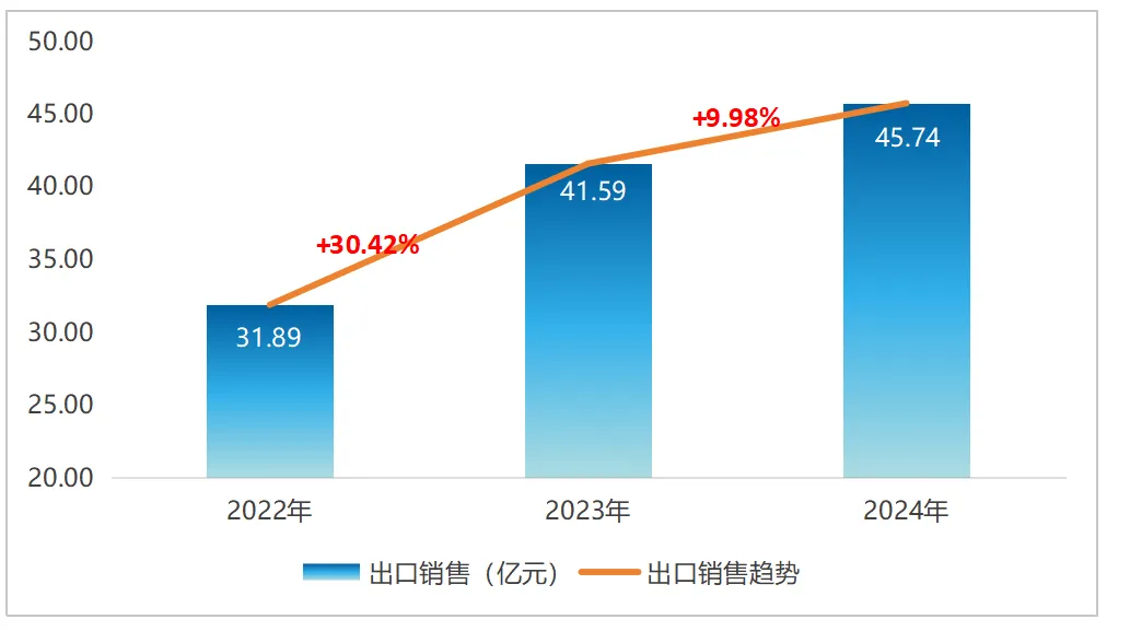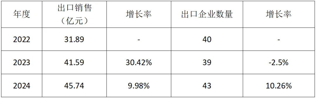 2024年,54家企业的统计数据表明,总出口金额达到约45.74亿元人民币,同比增长9.98%;有出口业务的企业达到43家,较2023年增长10.25%。2023比2022年增长幅度超30%。参见表4: