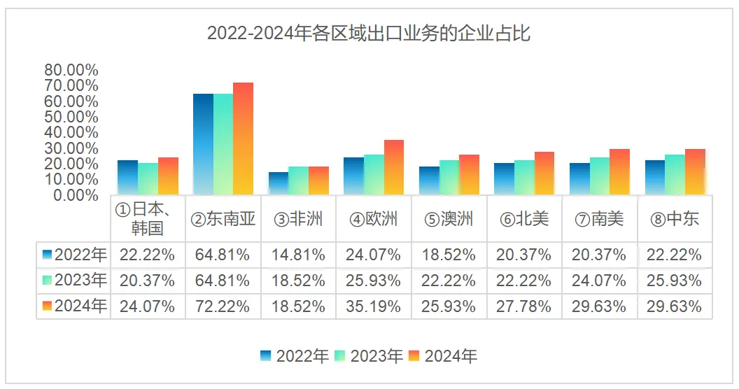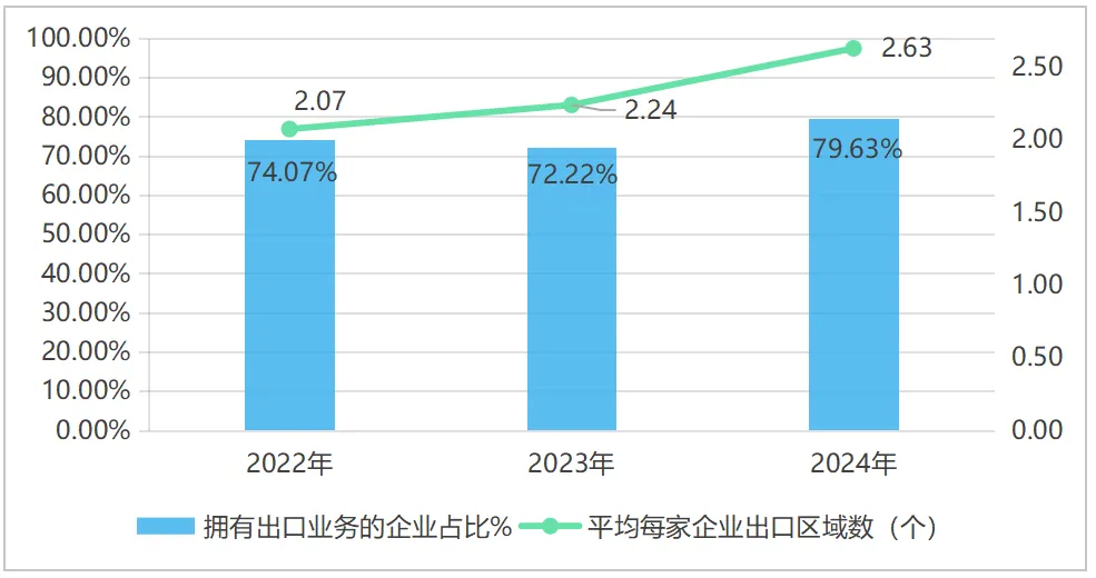 其中,拥有出口业务的企业占比从2022年的74.07%增长到2024年的79.62%;平均每家企业出口区域数从2022年的2.07个增长到2024年的2.63个。