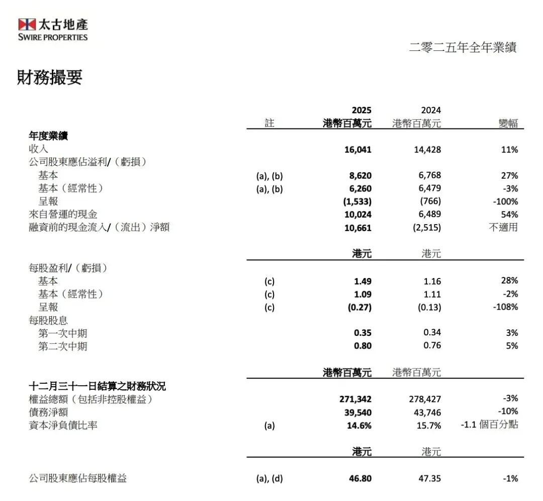 2025年,太古地产财务整体稳健,现金流充裕、债务合理,但受业务调整与市场影响,核心指标分化,呈现「表面溢利大增、核心盈利微降」态势,盈利质量待升。