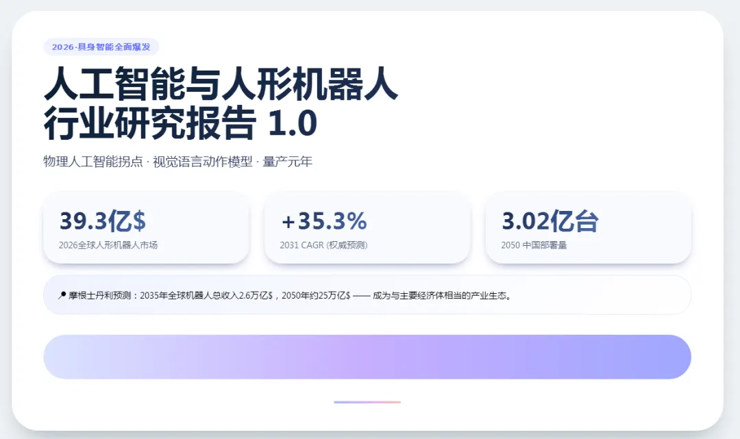 2026年是人工智能与先进制造业深度融合的历史性节点。人形机器人已褪去科幻色彩,正式成为重塑全球劳动力结构和工业生产方式的核心生产工具。针对这一趋势,行业参与者需确立以下战略认知: