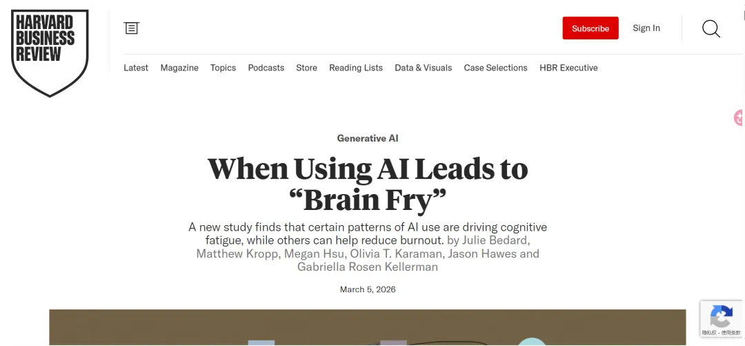 最近,顶尖咨询公司BCG联合研究人员在《Harvard Business Review》发布了一项最新研究,提出了一个非常形象的新概念——“AI Brain Fry”(AI脑疲劳)。研究发现,当员工同时使用过多AI工具时,反而更容易出现精神疲劳、决策困难甚至工作效率下降的情况。