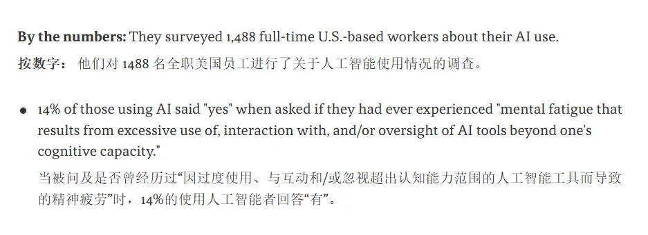 更重要的是,AI并没有完全替代工作,而是让人类变成了“AI监督者”。员工不仅要完成自己的任务,还要检查AI是否出错、判断AI生成内容是否合理,这种额外的监督工作实际上增加了认知负担。