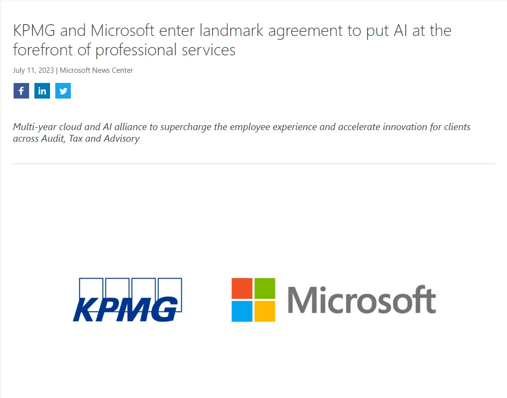 据报道,毕马威与微软达成了里程碑式的协议。毕马威计划在未来五年内,通过与微软扩大合作关系,在全球各业务领域投资20亿美元,用于人工智能和云服务。而这也是“四大”在这些技术上加倍投资的最新举措!