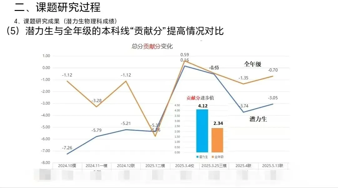 课题研究过程中,扎实开展“项目式辅导”教学活动,并通过多轮考试数据,对比分析了潜力生与全年级的本科线“贡献分”提高情况,考试时间跨度涵盖2024年10月模考、2024年11月一模、2024年12月联考、2025年1月二模、2025年3月4日校考、2025年3月25日三模、2025年4月联考、2025年5月13日联考等。