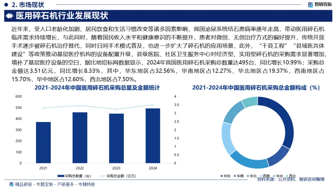 医用碎石机是一种医疗设备,利用超声波或激光技术粉碎体内结石,便于结石排出体外,主要用于肾结石等治疗。近年来,受人口老龄化加剧、居民饮食和生活习惯改变等诸多因素影响,我国泌尿系统结石患病率逐年走高,带动医用碎石机临床需求持续增长,与此同时,随着国民收入水平和健康意识的不断提升,患者对微创、无创治疗方式的偏好提升,传统开放手术逐步被碎石机治疗替代,同时日间手术模式普及,也进一步扩大了碎石机的应用场景,此外,“千县工程”“县域医共体建设”等政策推动基层医疗机构的设备配置升级,县级医院、社区卫生服务中心对经济型、实用型碎石机的采购需求显著增加,填补了基层医疗设备的空白,据比地招标网数据显示,2024年我国医用碎石机采购总数量达495台,同比增长10.99%;采购总金额达3.51亿元,同比增长8.33%。