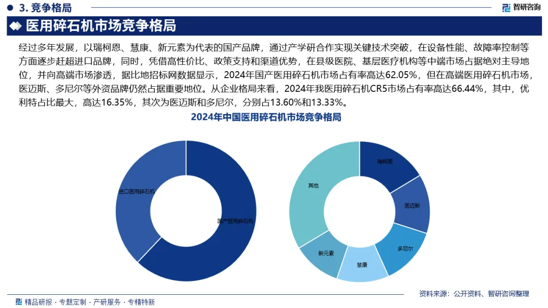 市场竞争格局:经过多年发展,以瑞柯恩、慧康、新元素为代表的国产品牌,通过产学研合作实现关键技术突破,在设备性能、故障率控制等方面逐步赶超进口品牌,同时,凭借高性价比、政策支持和渠道优势,在县级医院、基层医疗机构等中端市场占据绝对主导地位,并向高端市场渗透,据比地招标网数据显示,2024年国产医用碎石机市场占有率高达62.05%,但在高端医用碎石机市场,医迈斯、多尼尔等外资品牌仍然占据重要地位。从企业格局来看,2024年我医用碎石机CR5市场占有率高达66.44%,其中,优利特占比最大,高达16.35%,其次为医迈斯和多尼尔,分别占13.60%和13.33%。