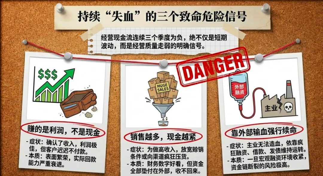 如果连续一个季度,也许还可以解释成短期波动;如果连续两个季度,要开始留意;如果连续三个季度以上,基本就不能再轻描淡写了。因为这大概率说明,问题已经不是暂时的,而是经营质量真的在走弱。这种危险,通常有三种表现。