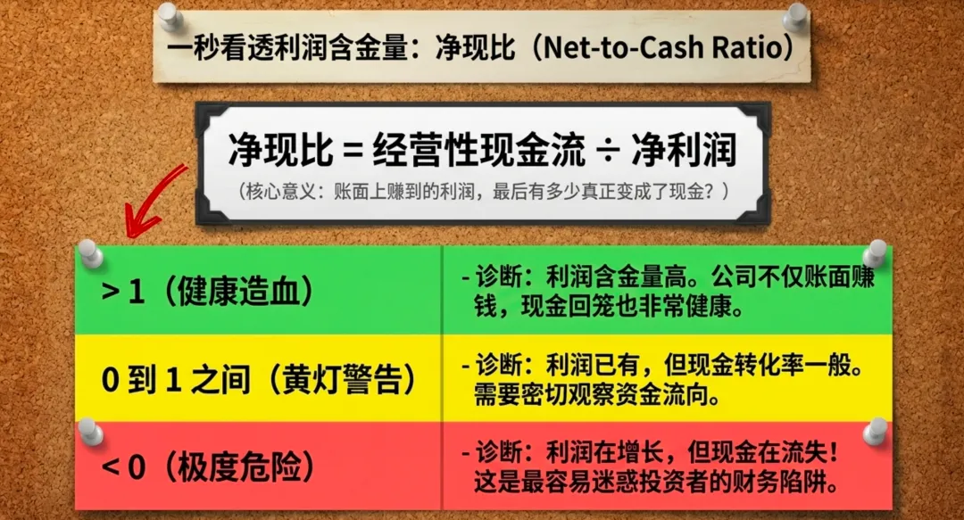 如果你觉得财务报表太复杂,不知道从哪儿下手,那先记住一个指标就够了:净现比 = 经营性现金流 ÷ 净利润