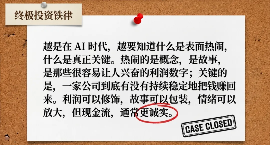 所以,AI 可以帮你更快看懂一家公司。但如果你问我,判断它值不值得长期持有,最先看什么?我的答案还是那句:先看经营性现金流。因为利润可以修饰,故事可以包装,情绪可以放大,但现金流,通常更诚实。