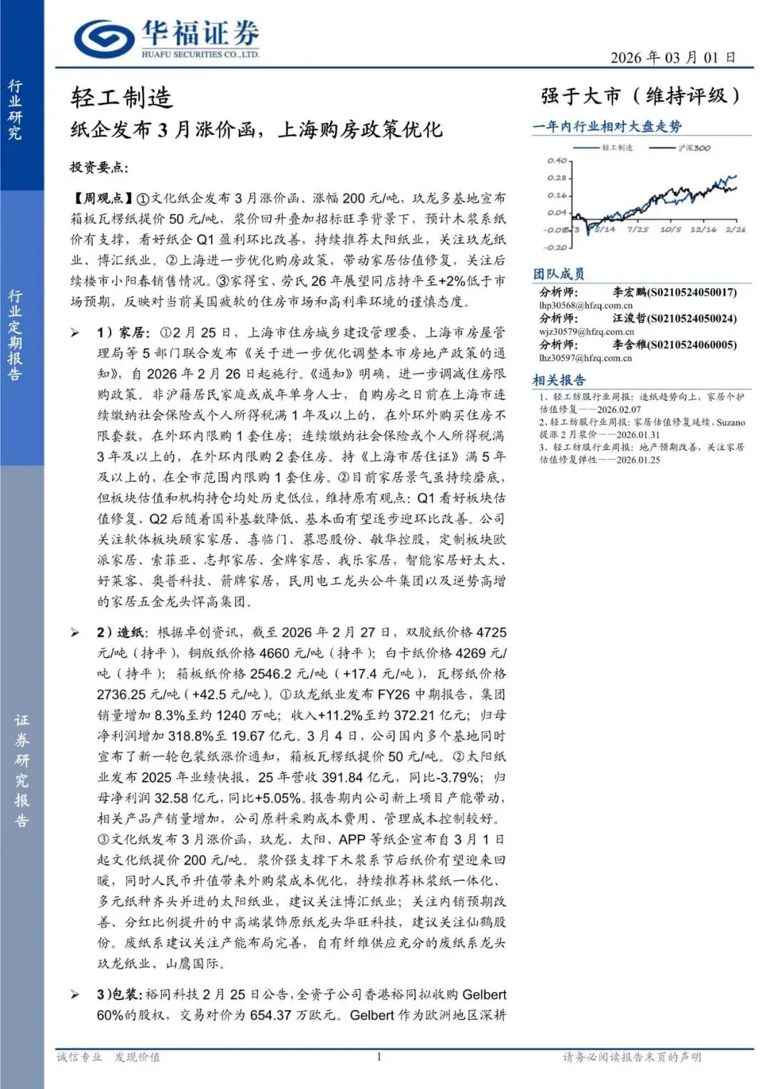 回复暗号:轻工制造行业定期报告:纸企发布3月涨价函,上海购房政策优化-260301-华福证券-21页